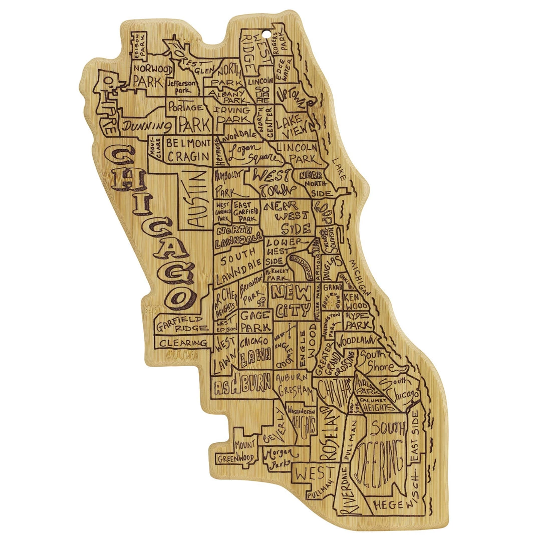 Celebrate “The Windy City” with this bamboo serving and cutting board featuring laser-engraved artwork of the neighborhoods that make up Chicago.