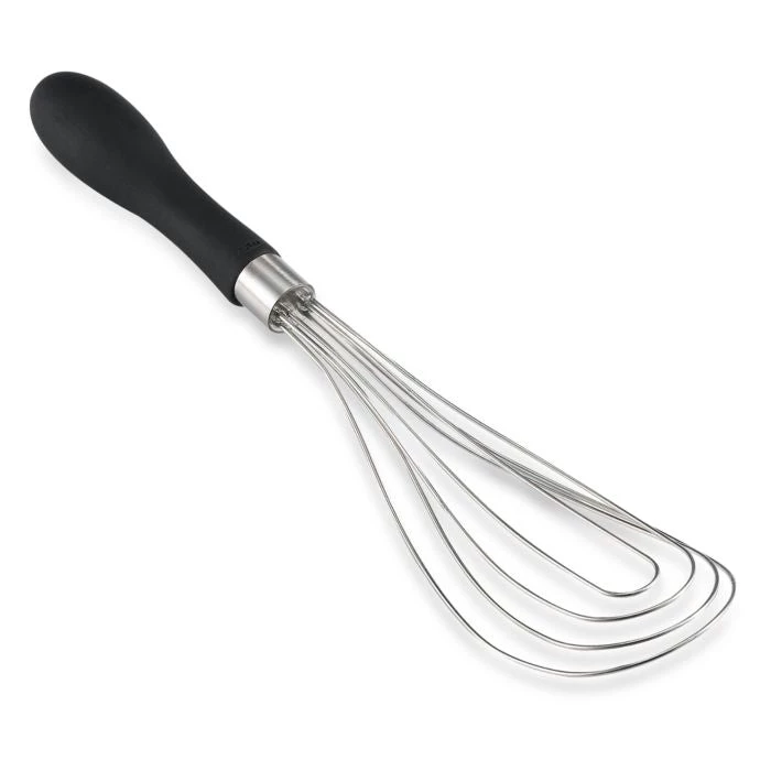 This versatile whisk features polished stainless steel wires and a flat shape, making it perfect for deglazing a pan. Its innovative handle shape and soft grip absorb pressure and make it comfortable to hold and use.