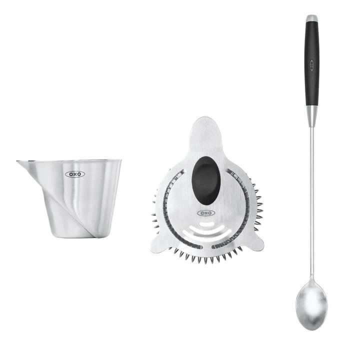 Prepare tasty cocktails at your home bar with the help of this 3-Piece Stainless Steel Strain and Stir Cocktail Set from OXO Good Grips. Crafted of durable stainless steel, the set includes a spinning bar spoon, double jigger, and strainer.