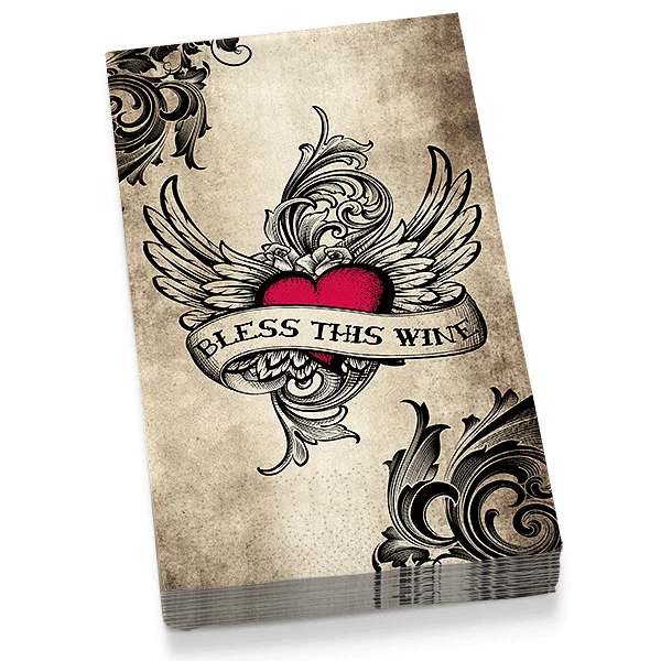 Graphic winged hearts on a rustic backdrop adorn these guest towel napkins. They are 3-ply, and contain 20 per pack.