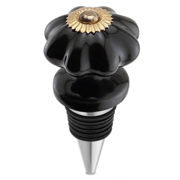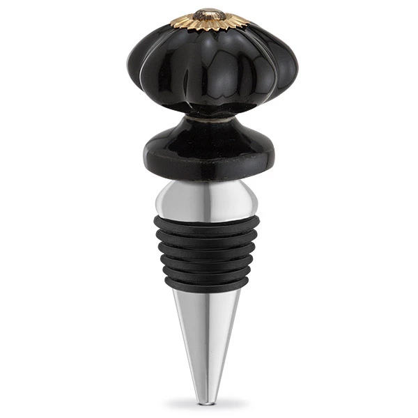 It’s a bohemian state of mind. This chic jet black ceramic stopper features a beautiful brass top and seals a bottle with polished metal base and flexible adjusting width rubber seal.