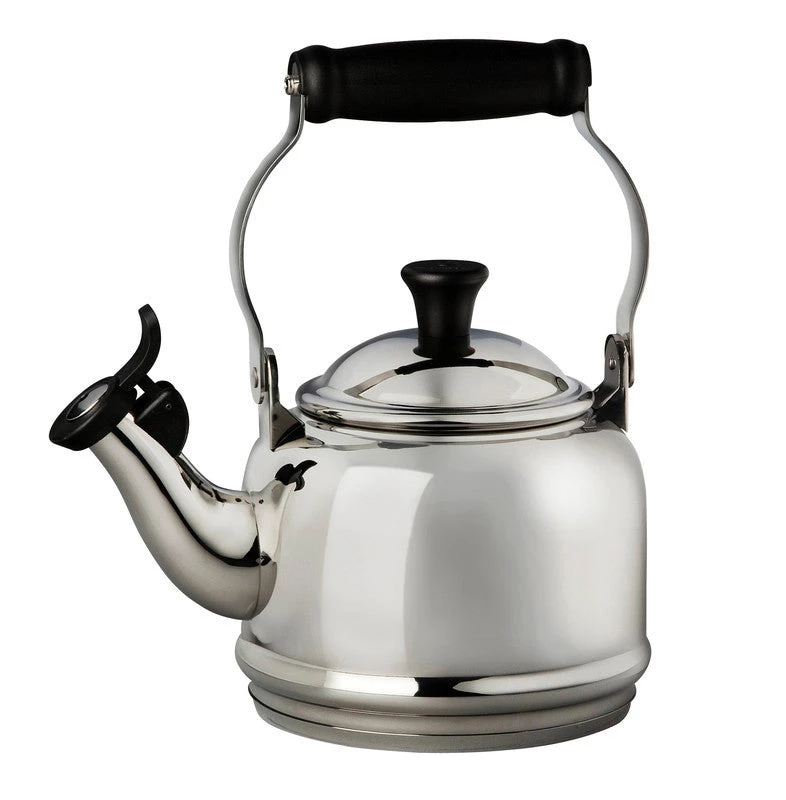 Styled after Le Creuset’s enamel-on-steel Demi Kettle, the stainless steel version adds a touch of contemporary style to the stovetop with its lustrous finish and charming silhouette.