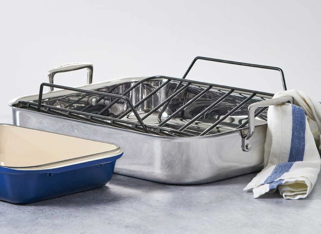 Roast meats and vegetables to perfection in this stainless steel roasting pan. A precision-pour rim creates clean pouring and a nonstick rack elevates food for even cooking.
