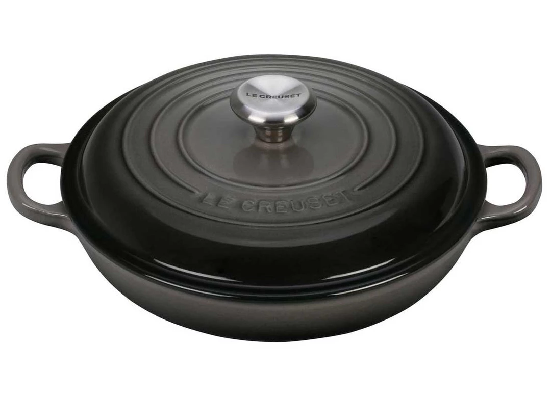 The enameled cast iron braiser is uniquely designed for maximum performance, transforming tough cuts of meat and hearty vegetables into tender, flavorful dishes. Food is first seared over high heat, then finished slowly in a flavorful liquid. The wide base of the braiser allows ingredients to be placed in a single layer for proper searing; once liquid is added, the domed lid continuously circulates steam to lock in moisture and flavor.