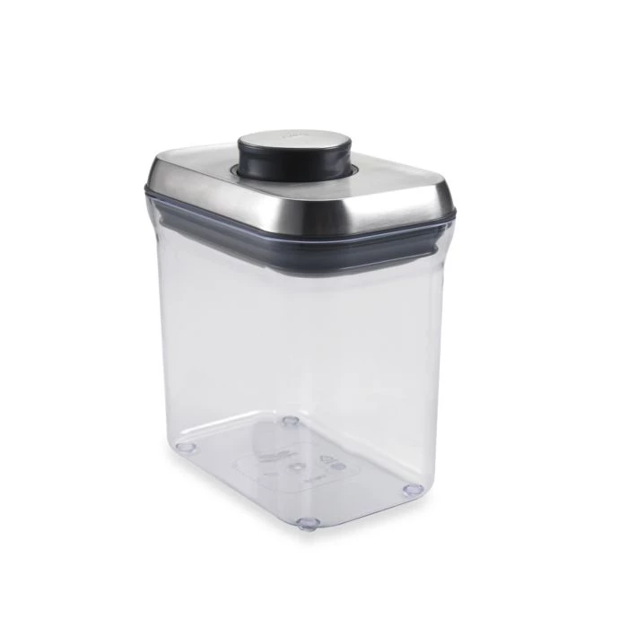 The simple and elegant design of the OXO SteeL POP Food Storage Containers make organizing kitchen cabinets and pantry shelves easy. Designed with a modular stacking system, the container offers simple pouring. Pop up button handle maximizes space.