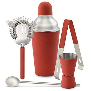 This 5-piece barware set includes 18 oz. shaker, bar spoon, cocktail strainer, tongs and jigger. Stainless steel with rubberized coating for comfortable grip. (3 1/2” x 8 1/2” Shaker 7 1/2” Spoon 3 5/8” x 6 7/8” Strainer 3/4” x 6 1/2” Tongs 2 3/4” x 1 1/2” Jigger)