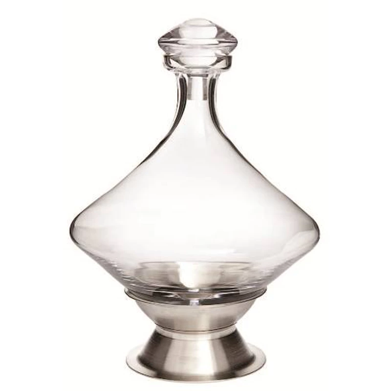 Orbital Decanter with Silver Plated Base and Crystal Stopper – 60 oz. capacity ( 1 qt. 28 oz.). 10-1/2″ tall (with stopper) The wines served in our Orbital Wine Decanter w/ Silver Plated Base may taste out of this world, but that’s not the reason for its name. When the Orbital Wine Decanter w/ Silver Plated Base is removed from its tastefully simple silver-plated base, its “V”-shaped base causes it to roll gently from side to side on your table, and the wine within can breathe fully while the sediment stays in the bottom. The tight-fitting crystal stopper of the Orbital Wine Decanter w/ Silver Plated Base prevents spills until you’re ready to pour. 7-1/2″ wide.