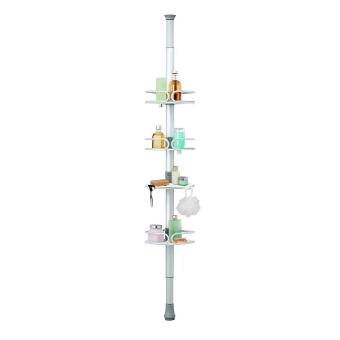 The OXO 4-Tier Anodized Aluminum Tension Pole Shower Caddy will keep shampoo bottles and toiletries organized; it also helps eliminate clutter. Its anodized aluminum design is rust-proof while the tension pole extends up to 9′.