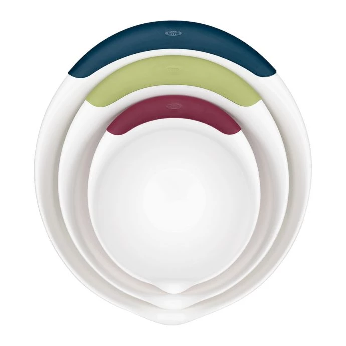 Perfect for mixing batters, marinades, and more. Set includes one of each: 1 1/2-quart, 3-quart, and 5-quart bowls.