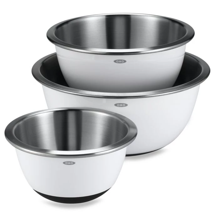 - OXO Good Grips 3-Piece Stainless Steel Mixing Bowl Set feature brushed stainless steel interiors and plastic exteriors to retain temperatures for mixing, marinating and chilling