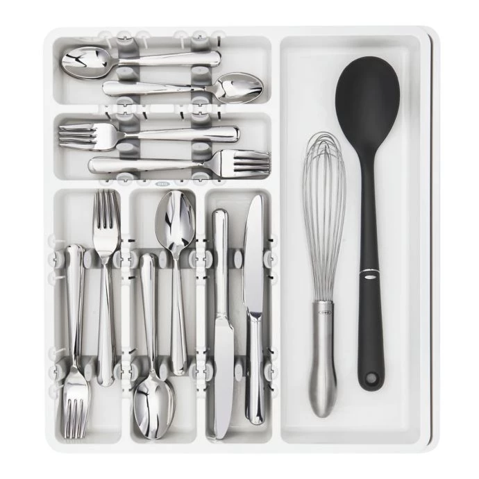 - Configure utensils in a way that fits in seamlessly inside a drawer by using the Expandable Utensil Organizer by OXO Good Grips to hold forks, knives and spoons