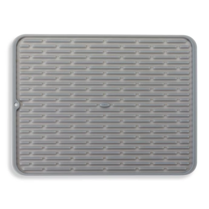 OXO Good Grips Large Silicone Dish Drying Mat efficiently dries large and delicate items. The drying mat’s unique ribbed design maximizes aeration and elevates items, keeping them clean and sanitary.