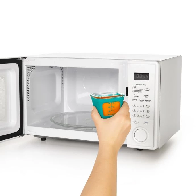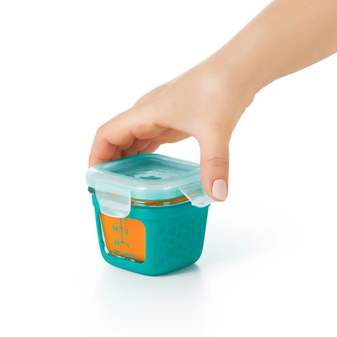 Portion, store, heat, and serve baby food with these OXO Tot Glass Baby Food Storage Blocks with Silicone Sleeves. They are made of borosilicate glass, which is thermal-shock-resistant and include a stackable tray that makes for easy storage.