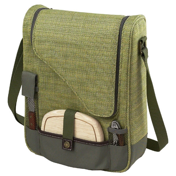 Compact Thermal Shield insulated wine and cheese cooler includes: acrylic glasses, napkins, corkscrew, bottle stopper, cheese knife, and hardwood cutting board. This unique set holds two bottles and can be used as a three bottle carrier with glasses removed. Includes adjustable padded bottle dividers. Attractive slim profile case has a comfortable adjustable shoulder strap to carry. Designed and Assembled in the USA. Lifetime Warranty.
