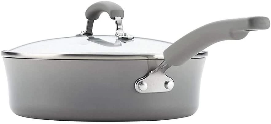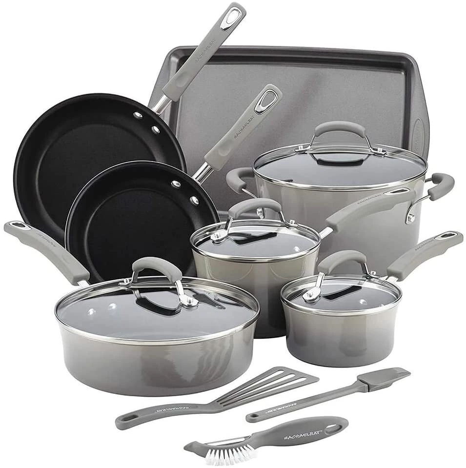 Cook, bake and prep for meals using the Rachael Ray 14-pc. Hard Enamel Nonstick Cookware Set. This set includes pots, pans, skillets, kitchen tools and a baking sheet so you can easily whip up all your favorite dishes. Silicone handles provide a secure grip, glass lids help you monitor the cooking progress and nonstick interiors offer effortless food release and make cleanup a breeze. This cookware set has all the ingredients you need to make delicious meals for your family.
