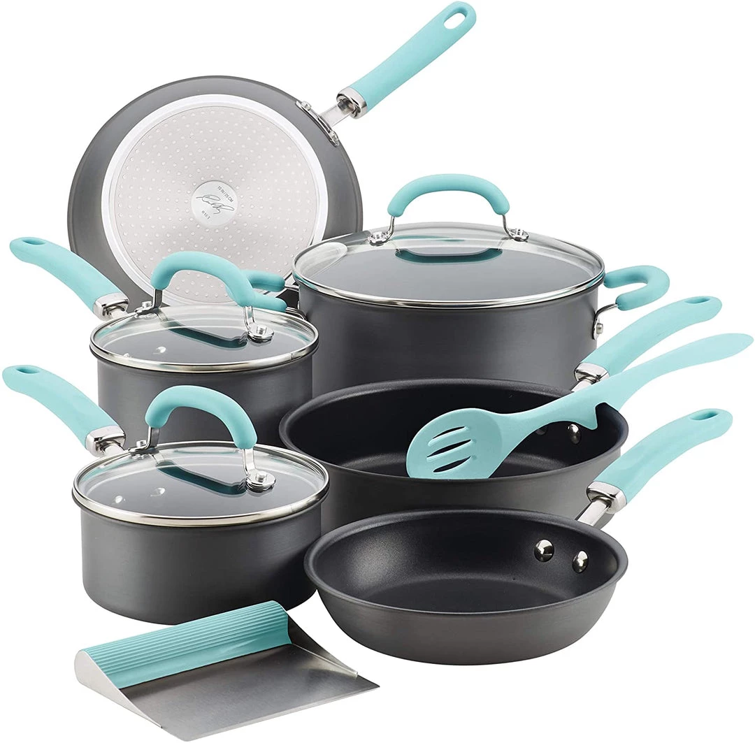 Rachael Ray Create Delicious 11-Piece Hard-Anodized Aluminum Nonstick Cookware Set brings high performance and cooking convenience to home chefs eager for kitchen versatility with long-lasting dependability. Constructed from hard-anodized aluminum, this collection of essential pots and pans is enhanced with PlatinumShield Technology nonstick to be 9 times harder than titanium for effortless food release. Colorful, dual-riveted stainless steel and silicone handles provide comfort and control that’s oven safe to 400°F.Â