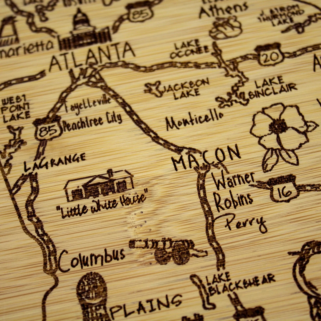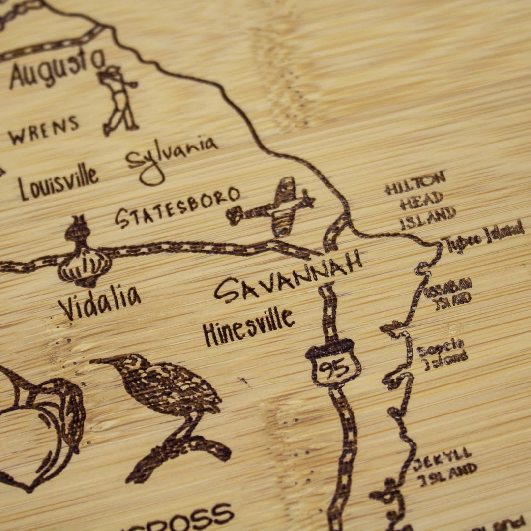 Savor a slice of The Peach State with the Totally Bamboo A Slice of Life Georgia Bamboo Serving and Cutting Board! This eye-catching serving board is a wonderful way to celebrate the state of Georgia. It’s a perfect choice to serve a selection of delicious cheeses, crackers and finger foods with friends and family. One side of the board features laser-etched artwork of the outline of the state and fun call outs of the top cities, sights and attractions. From Atlanta to Savannah, Rome to Athens, The Okefenokee Swamp to Chattahoochee Forest and everywhere in between, this board features everything that makes Georgia great. When not being used for serving, the board can be flipped over to provide an ideal large cutting board surface. The board is constructed of organically-grown Moso bamboo, which is gentler on knives than plastic and easier to care for than hardwood. The two-tone design clearly highlights the natural beauty of bamboo. The board measures 11″ x 8-3/4″ x 1/2″. Whether as a gift for the Georgian in your life (or for yourself), this Slice of Life board is sure to be a hit!