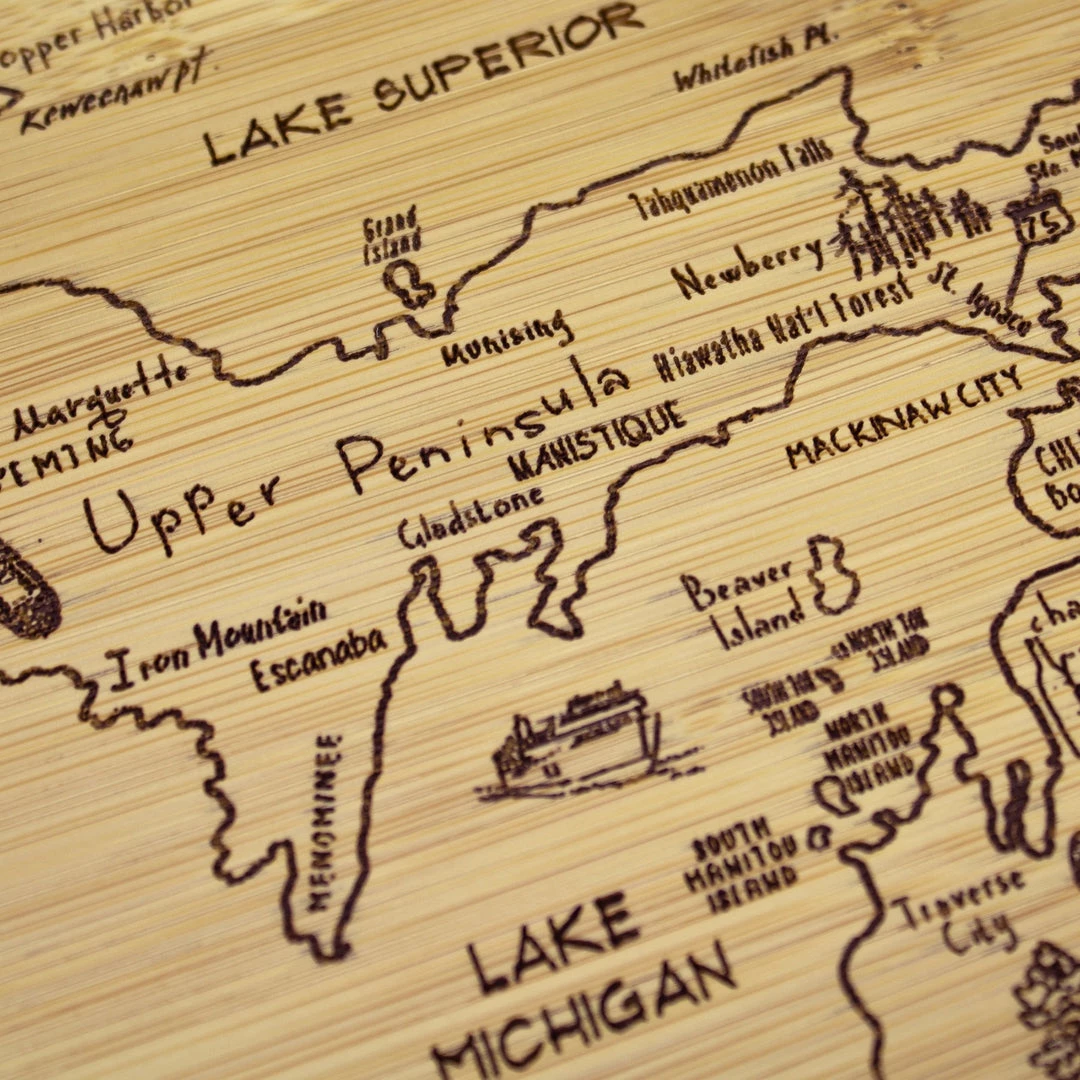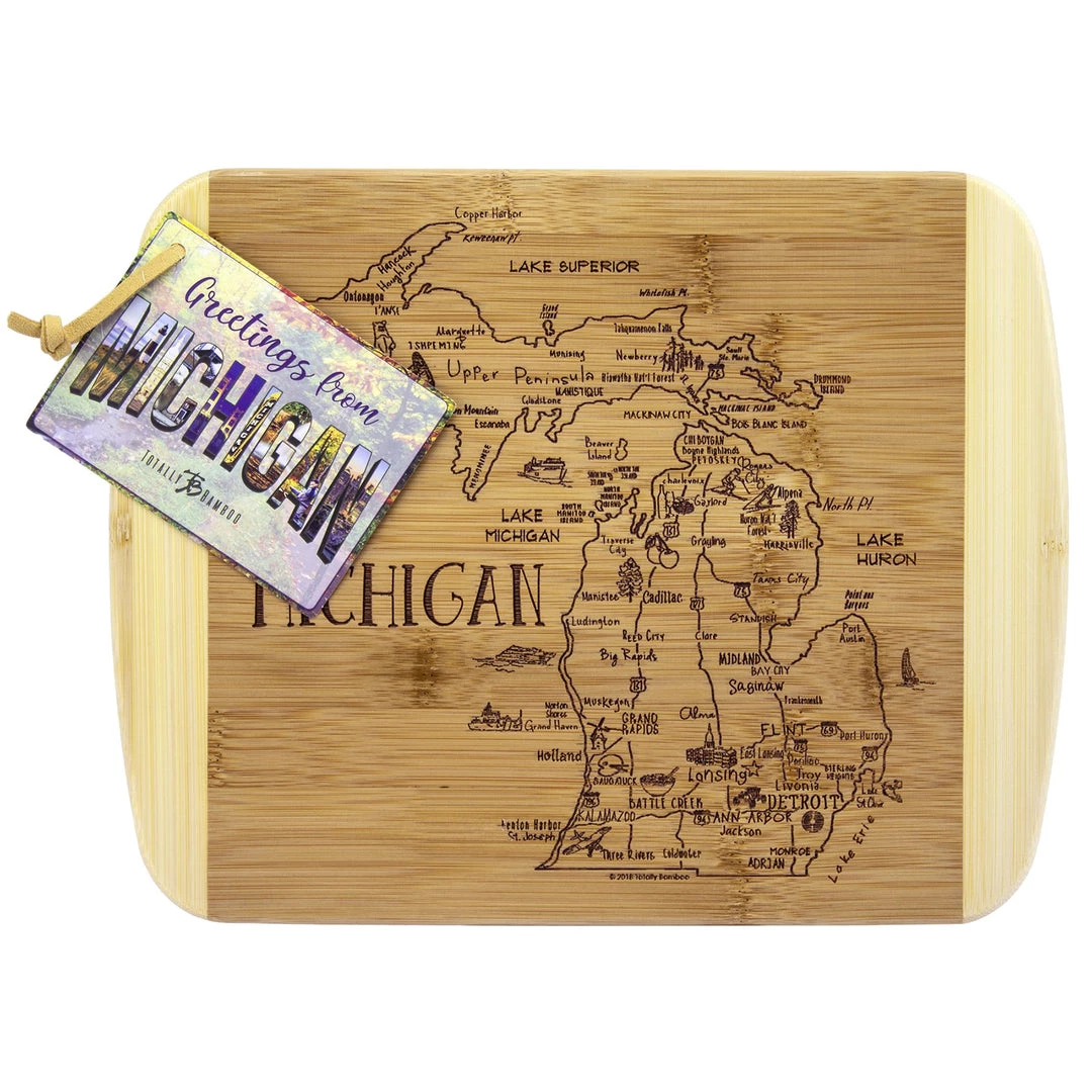 Savor a slice of The Great Lakes State with the Totally Bamboo A Slice of Life Michigan Bamboo Serving and Cutting Board! This eye-catching serving board is a wonderful way to celebrate the state of Michigan. It’s a perfect choice to serve a selection of delicious cheeses, crackers and finger foods with friends and family. One side of the board features laser-etched artwork of the outline of the state and fun call outs of the top cities, sights and attractions. From Ann Arbor to Cheboygan, Detroit to Cadillac, Kalamazoo to Lansing and everywhere in between, this board features everything that makes Michigan great. When not being used for serving, the board can be flipped over to provide an ideal large cutting board surface. The board is constructed of organically-grown Moso bamboo, which is gentler on knives than plastic and easier to care for than hardwood. The two-tone design clearly highlights the natural beauty of bamboo. The board measures 11″ x 8-3/4″ x 1/2″. Whether as a gift for the Michigander in your life (or for yourself), this Slice of Life board is sure to be a hit!