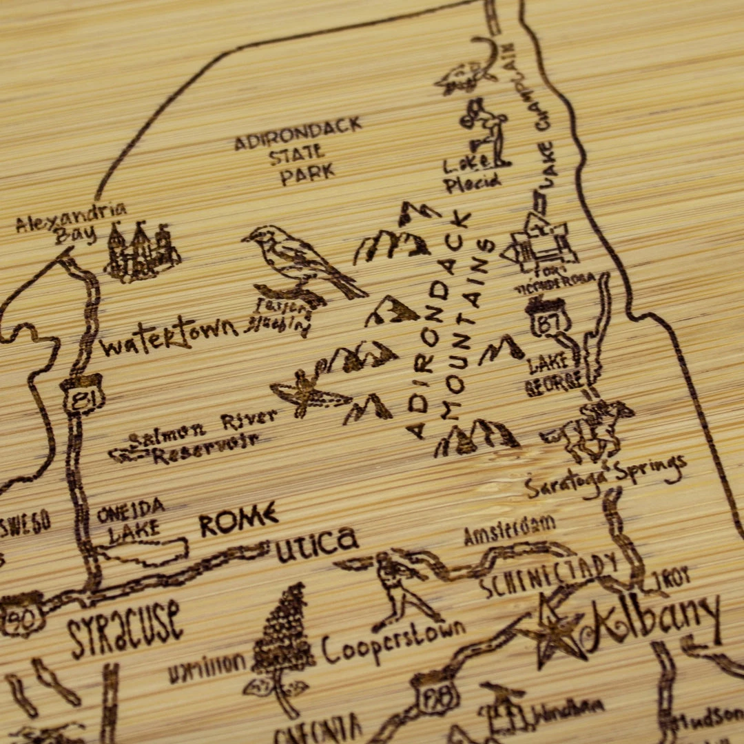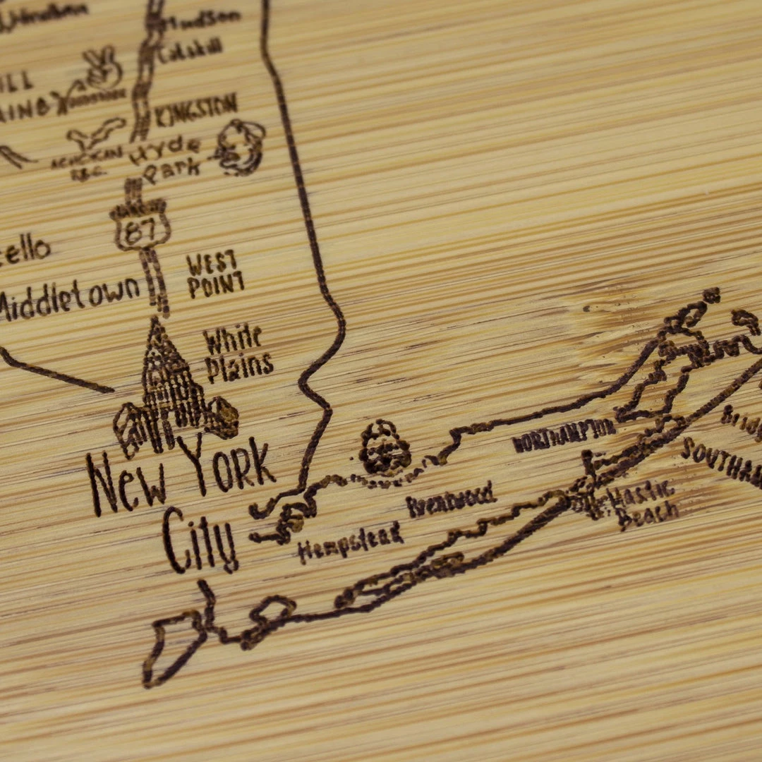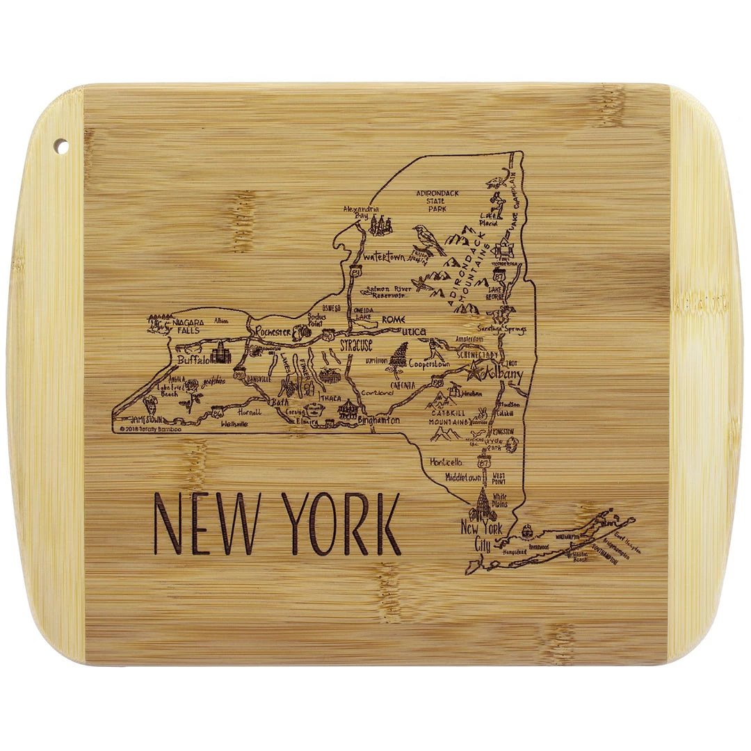 Savor a slice of The Empire State with the Totally Bamboo A Slice of Life New York Bamboo Serving and Cutting Board! This eye-catching serving board is a wonderful way to celebrate the state of New York. It’s a perfect choice to serve a selection of delicious cheeses, crackers and finger foods with friends and family. One side of the board features laser-etched artwork of the outline of the state and fun call outs of the top cities, sights and attractions. From New York City to Syracuse, Cooperstown to Buffalo, Niagara Falls to the Adirondacks and everywhere in between, this board features everything that makes New York great. When not being used for serving, the board can be flipped over to provide an ideal large cutting board surface. The board is constructed of organically-grown Moso bamboo, which is gentler on knives than plastic and easier to care for than hardwood. The two-tone design clearly highlights the natural beauty of bamboo. The board measures 11″ x 8-3/4″ x 1/2″. Whether as a gift for the New Yorker in your life (or for yourself), this Slice of Life board is sure to be a hit!