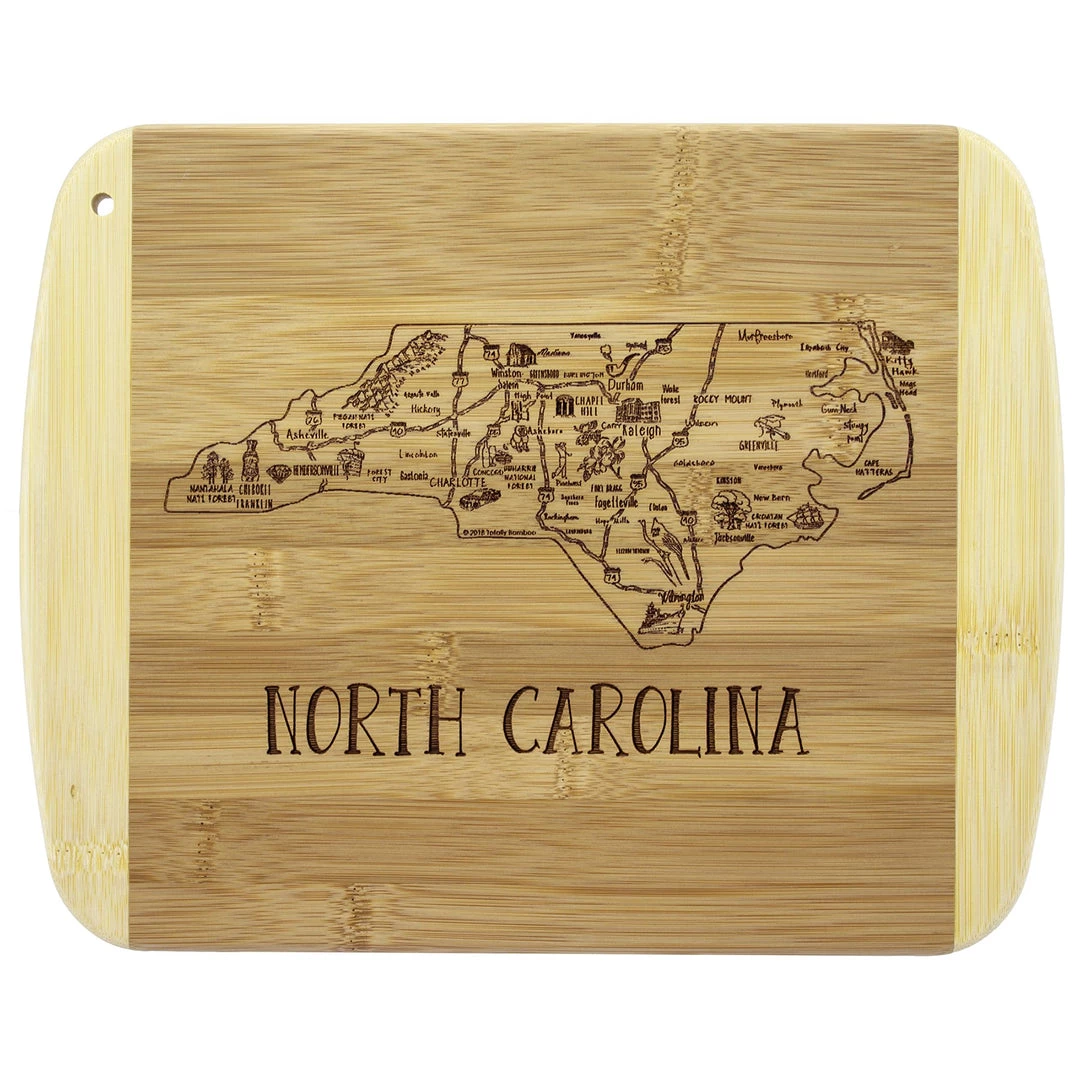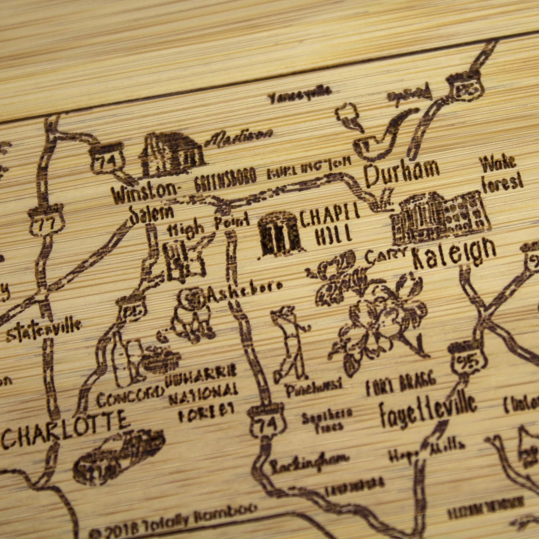 Savor a slice of The Tar Heel State with the Totally Bamboo A Slice of Life North Carolina Bamboo Serving and Cutting Board! This eye-catching serving board is a wonderful way to celebrate the state of North Carolina. It’s a perfect choice to serve a selection of delicious cheeses, crackers and finger foods with friends and family. One side of the board features laser-etched artwork of the outline of the state and fun call outs of the top cities, sights and attractions. From Charlotte to Greenville, Raleigh to Wilmington, Kitty Hawk to Chapel Hill and everywhere in between, this board features everything that makes North Carolina great. When not being used for serving, the board can be flipped over to provide an ideal large cutting board surface. The board is constructed of organically-grown Moso bamboo, which is gentler on knives than plastic and easier to care for than hardwood. The two-tone design clearly highlights the natural beauty of bamboo. The board measures 11″ x 8-3/4″ x 1/2″. Whether as a gift for the North Carolinian in your life (or for yourself), this Slice of Life board is sure to be a hit!