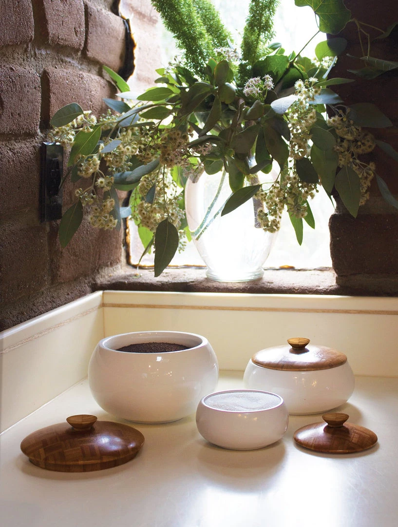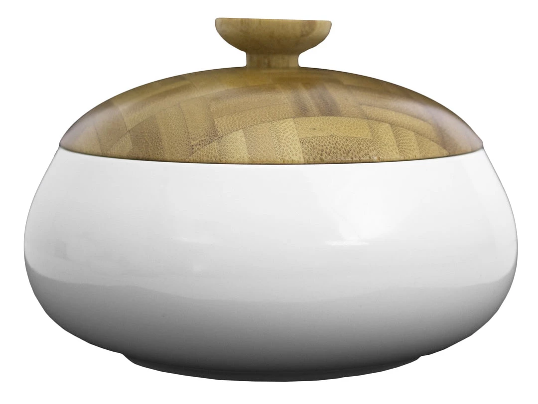 Our medium ceramic canister with end grain bamboo lid holds 3 cups. Air tight silicone seal helps maintain freshness.