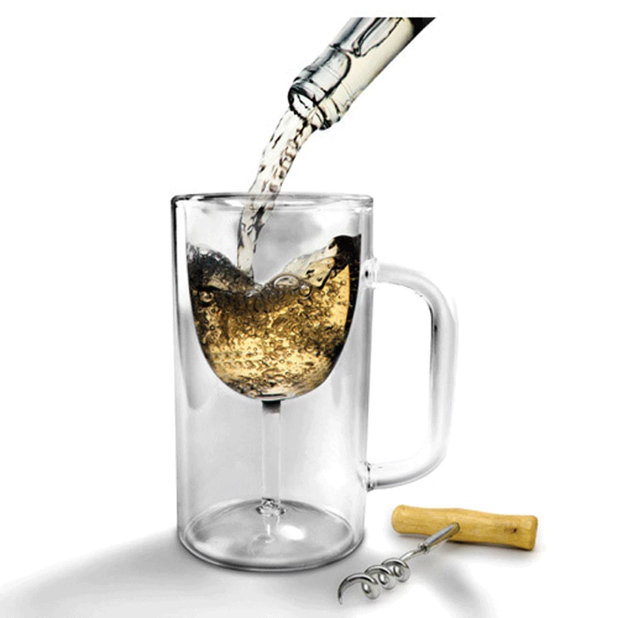 WINESTEIN a beer-lover’s wine glass or a wine-lover’s beer glass? You like sipping wine, but sometimes you’re just more comfortable with a mug in your mitt. Well this double-walled do-it-all lets you have it both ways. Elegant wine stem on the inside, manly beer stein on the outside, it’s a glass for all reasons. So pour yourself a nice measure of vino, grab it with gusto, thoughtfully inhale the bouquet, then toss it back. Mmmm…don’t you agree …Winestein is pithy and exuberant, leaving a hint of subtle irony on the tongue.