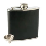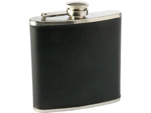 Our handsome Monte Carlo flask is made from black faux leather and stainless steel. It can also be customized with your own logo. Holds 6 oz.